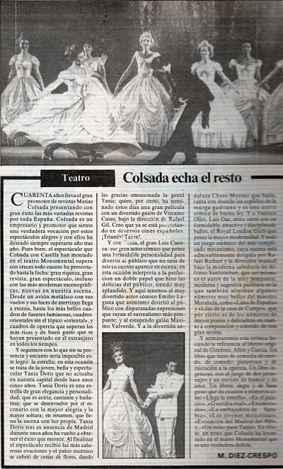 Con tan dispares opiniones, en negro sobre blanco, sobre un mismo espectáculo de la marca creada por Colsada, fuera su rumbo acertado o no, tuvimos Tania Doris, artista, trabajadora y constante, reclamando modernizarse y no encasillarse, por muchos más años, en su reino indiscutible, el Apolo de la ciudad Condal.