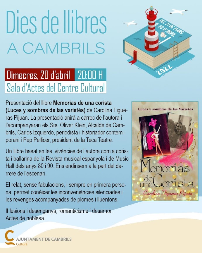 Gracias a la Concejalía de Cultura del Excmo. Ayuntamiento de Cambrils, presentaremos «MEMORIAS DE UNA CORISTA» Luces y sombras de las Varietés, el próximo 20 de abril a las 20 horas en el Centre Cultural.