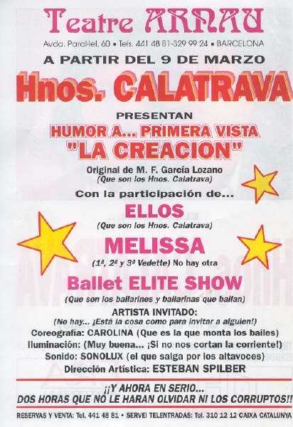 Los hermanos Calatrava «Sesenta años al servicio de la risa». Gracias Mariano Vázquez por esta idea que pone en el escenario el aprecio y el duro trabajo muchas veces ignorado por el gran público. Merecidísimo homenaje a dos artistas que también fueron mis jefes y me llevaron de vuelta al Paralelo 10 años después de abandonarlo como su coreógrafa. Un honor, con ellos, el trabajo más divertido de mi vida apasionante, viajando por esa España que pudo disfrutaros en directo.
