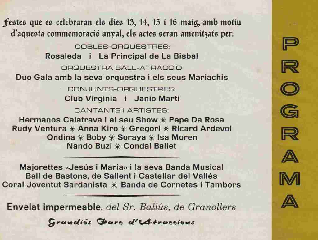 Este programa de la Festa Major de Puigreig, da una idea de los elencos de la época, al igual que esta parte de un poster doblado que conservo, de la Festa de Santa Coloma de Farners.