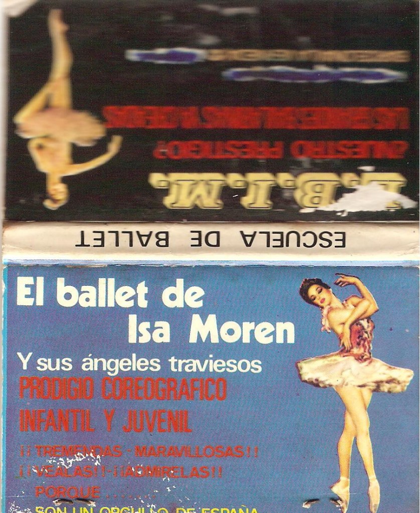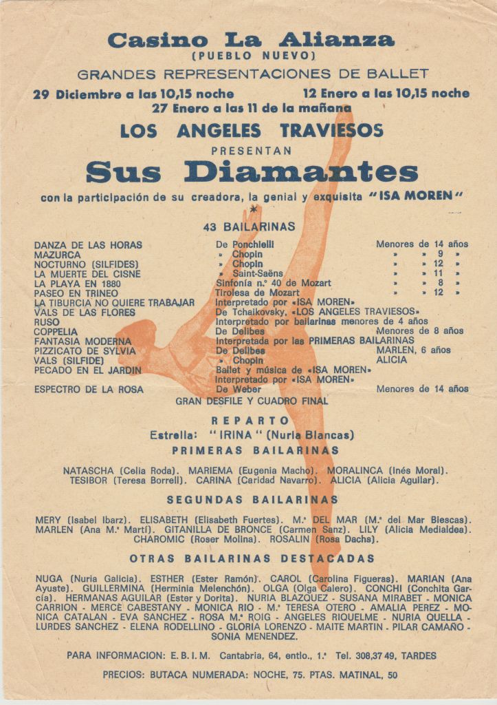 A mis doce años cumplidos, esta fecha se me antoja profética, pues en la misma página, en la cartelera de teatro y de cine, contemplo dos aspectos notorios: Una revista en el Apolo titulada Yo soy la tentación, con Tania Doris y Luis Cuenca. Y una película donde constaba el patán, que tanto se molestó en interferir en mi existencia, con Simón Andreu, con quien compartí escena en Dark Justice. Claro que entonces era una niña. Por lo que se refiere a Fábregas y el fabuloso ámbito del ballet, ¿un millar de espectadores?; ¿éxito obtenido?; ¿excelente actuación? Aquel debut fue un estrepitoso fracaso. Para la segunda función programada, y viendo que no conseguía llenar las casillas en el plano de las butacas a la venta, nos mandó a las alumnas adolescentes a pegar carteles en las tiendas de Pueblo Nuevo y de Sant Martí de Provençals, con la consigna de regalar muchas entradas. Esto enfureció a nuestros familiares que sí pagaron sus entradas, dos y tres veces. Para más falta de pedagogía, las alumnas, con seudónimos pomposos, fuimos clasificadas en los programas, en un cartel y en unas cajitas de cerillas por categorías: estrella, primeras bailarinas, segundas bailarinas y otras bailarinas destacadas. El instaurar esa conciencia de clase, entre aficionadas, fue uno más de los errores que aquel hombre se dio el gusto de cometer ante el absoluto silencio de nuestras familias, a fin de cuentas, clientes, que debían escoger entre darnos una educación artística cercana, un hobby entretenido en el barrio o abandonar los dominios de aquel chalado.
