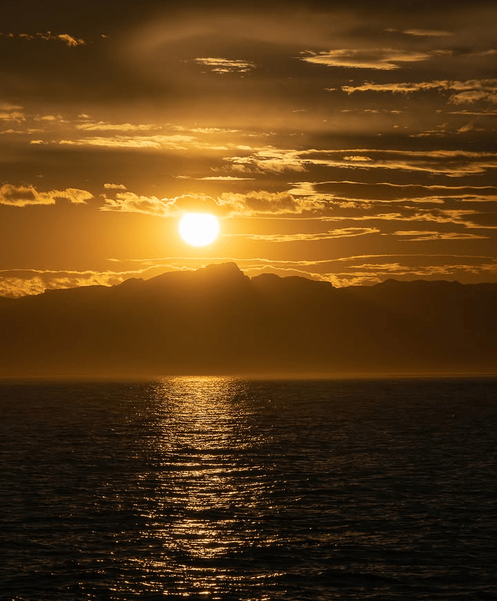 La primera intención es girar la cabeza para ver cómo el sol juega con la luz, las nubes, las montañas y el mar. Dejar que, con los últimos reflejos y las primeras sombras rosadas, violetas y azules, los ojos den paso a la paz mental. Escuchar, con el mismo detalle, los cantos de algún pajarillo y el zumbido del motor cercano… y entonces, al caer la noche, poniente se convierte en una delgada línea de luces en la costa, todas ellas guiñando, mientras las luces de la ciudad se apoderan poco a poco de la oscuridad.