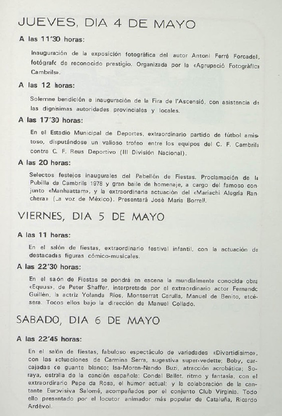 Hace apenas unos días, al finalizar la FIRA MULTISECTORIAL (número 66), el Archivo del Ayuntamiento de Cambrils, siempre tan amable, me rescató una imagen que encierra una de esas dulces coincidencias. En mi pantalla, el programa de 1978 anunciaba un espectáculo del primer representante artístico que me dio un sueldo como bailarina: el señor, con todas las letras, Ricardo Ardevol. El ‘Ballet Condal’, que aparece en este programa, fue el precursor del actual ‘Petit Ballet de Barcelona’, del cual también fui segunda coreógrafa. Su propia directora, Isa Moren, actuaba como pareja sexy acrobática con Nando Buzi, y nosotras, sus seis alumnas mayores, la acompañábamos. Yo todavía era menor de edad y llevaba conmigo un permiso paterno, firmado ante un juez.
