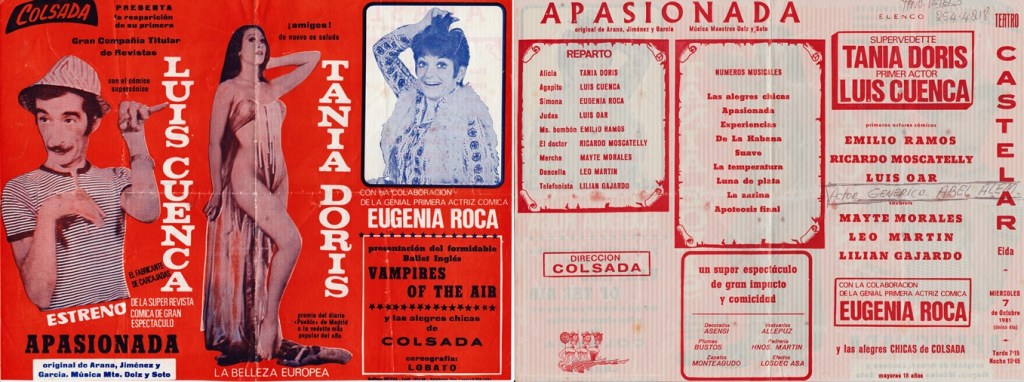 Tania Doris. Luis Cuenca. Luis Oar. Ricardo Moscatelli. Emilio Laguna. Ventura Oller. Lluís Torner. Eugenia Roca. Charo Moreno. Irene Daina. Lorena Montel. Emilio Ramos. Abel Alem. Vedettes-Soubrettes. Leo Martín. Lilian Gajardo. Mayte Morales. Maribel Pérez. Tita Cano. Alejandra Grepi. Sara Pecos. Caro Lina/Carol Yna.